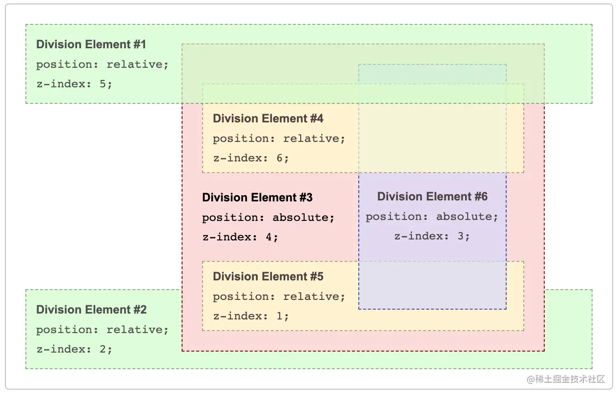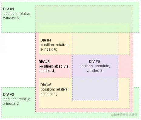 - DIV #6 - z-index is 3, stacked under an element with a z-index of 4, which results in a rendering order of 4.3