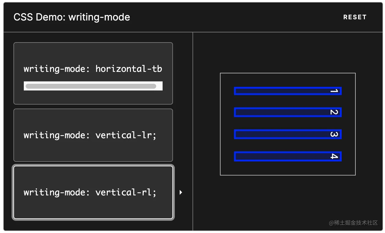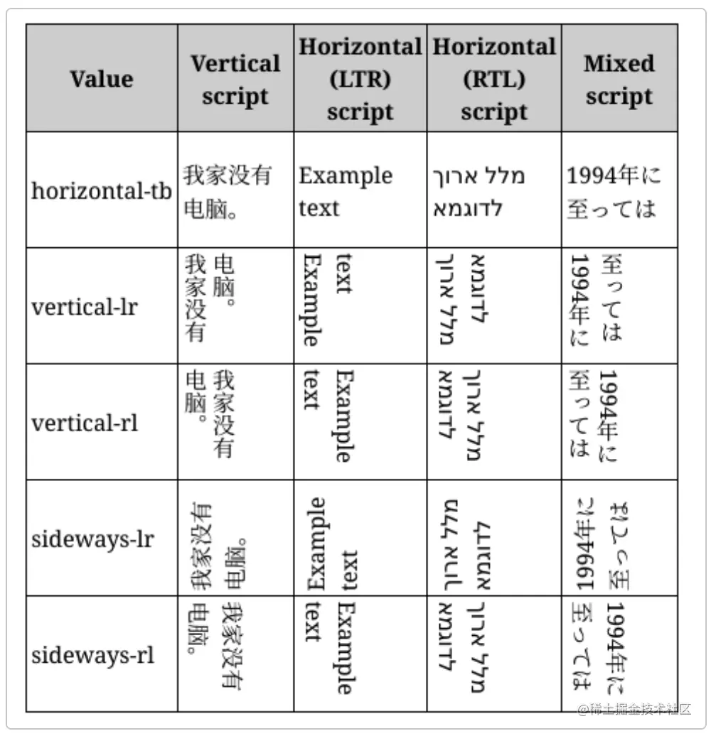 The writing-mode property is specified as one of the values listed below. The flow direction in horizontal scripts is also affected by the directionality of that script, either left-to-right (ltr, like English and most other languages) or right-to-left (rtl, like Hebrew or Arabic).