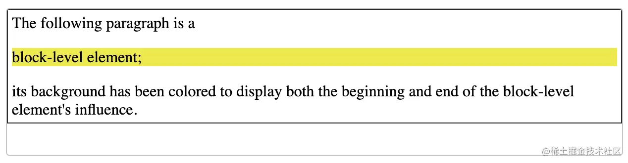 <p>I am a basic block level element. My adjacent block level elements sit on new lines below me.</p>