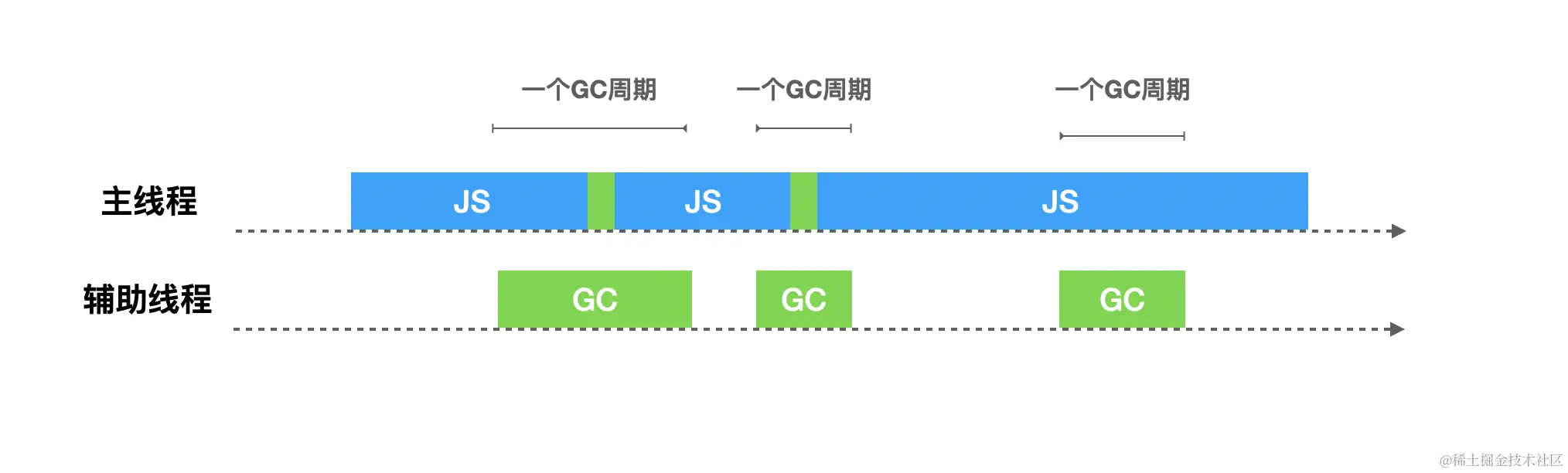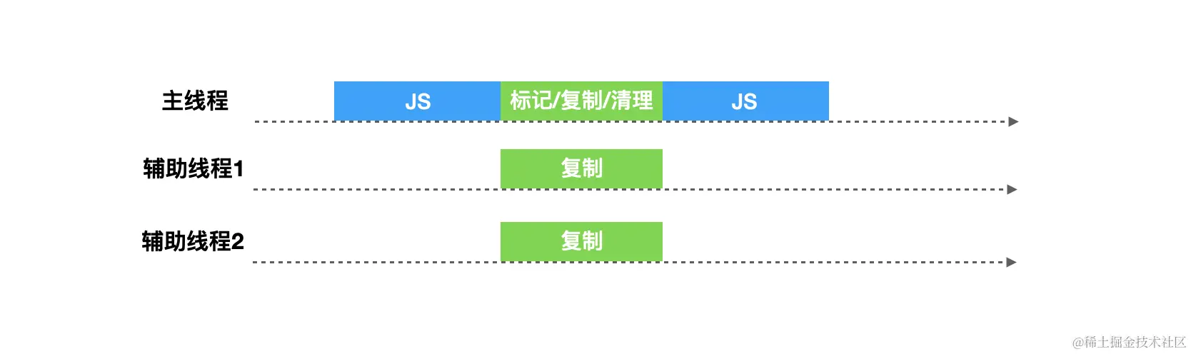 并发式GC允许在在垃圾回收的同时不需要将主线程挂起,两者可以同时进行,只有在个别时候需要短暂停下来让垃圾回收器做一些特殊的操作。但是这种方式也要面对增量回收的问题,就是在垃圾回收过程中,由于JavaScript代码在执行,堆中的对象的引用关系随时可能会变化,所以也要进行写屏障操作。