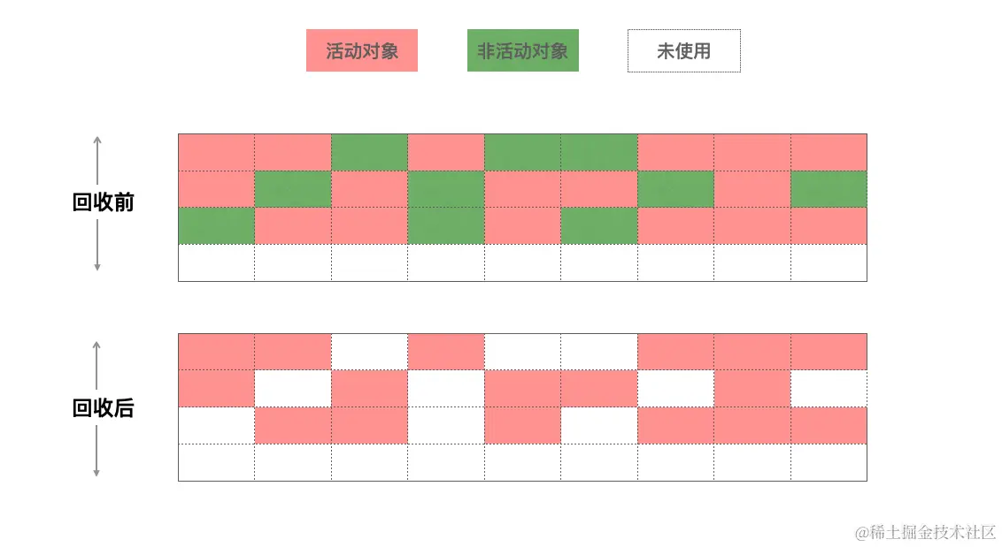 从图中可以看到清除后会有一些空,这些空留着显然很不合理,因为一旦有一些占用空间比较大的对象,这些空就用不上了,因此还需要Mark-Compact算法的帮助,这个算法就是在标记清除之后重新帮忙整理的,将所有的活动对象往一端移动,移动完成后,直接清理掉边界外的内存。这样老生代垃圾回收器就完成啦。