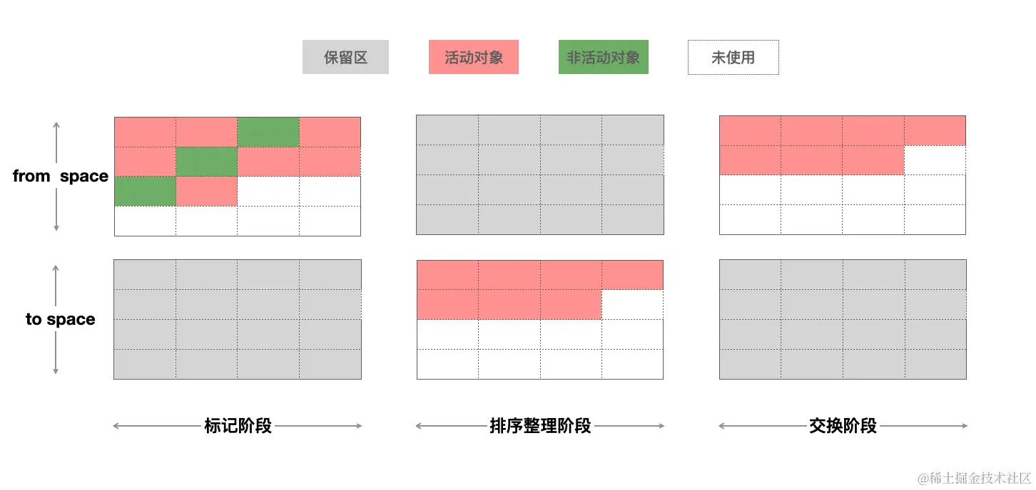 scavenge算法做的事情就是把新生代中的对象标记为活动对象和非活动对象,将新生代区域分成两个部分一个是from-space,一个是to-space,还没进行垃圾回收前新生代对象都是在from-space中的。在标记完成之后,会将活动对象复制到to-space中去,并有序的排列起来。再把from-space和to-space角色互换,有点像fiber双缓存hhh