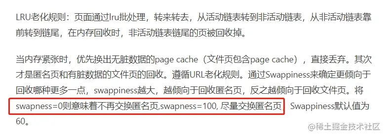 当内存紧张时,优先换出无脏数据的page cache (文件页包含page cache) ,直接丢弃。其次才是匿名页和有脏数据的文件页的回收。遵循URL老化规则。通过Swappiness来确定更倾向于回收哪种更多一点,swappiness越大,越倾向于回收匿名页,反之越倾向于回收文件页。