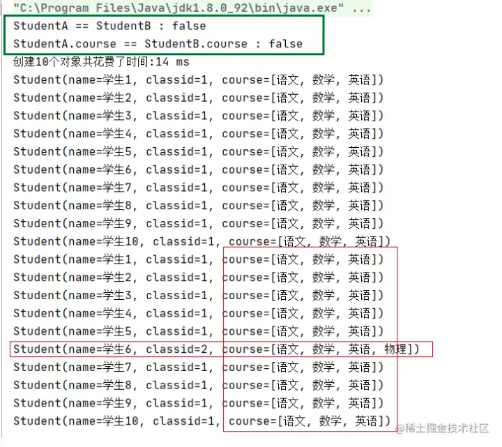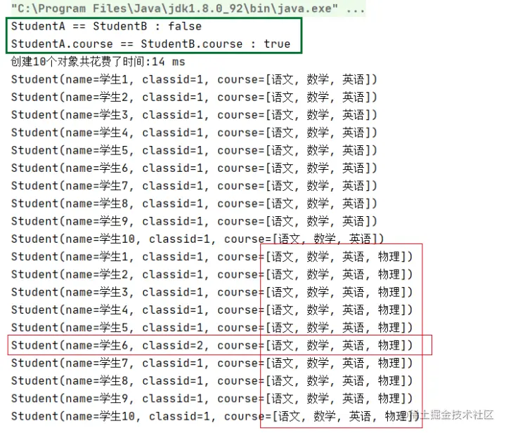 System.out.println("StudentA.course == StudentB.course : " + (studentA.getCourse() == studentB.getCourse()));