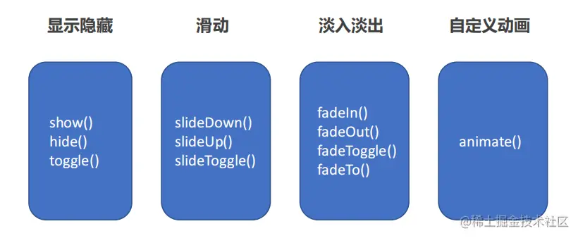 jQuery 给我们封装了很多动画效果,最为常见的如下: