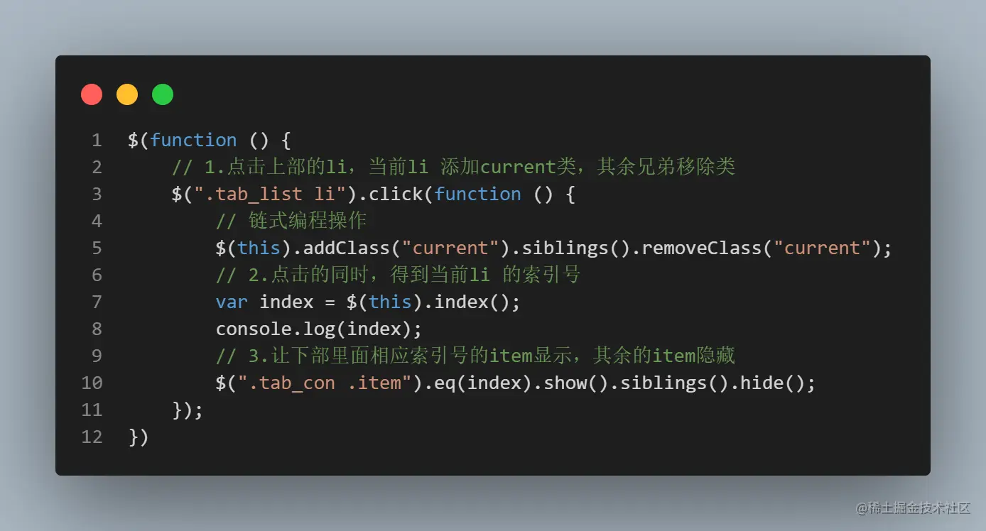 想要多选一的效果,排他思想:当前元素($(this))设置样式,其余的兄弟元素($(this).siblings())清除样式。
