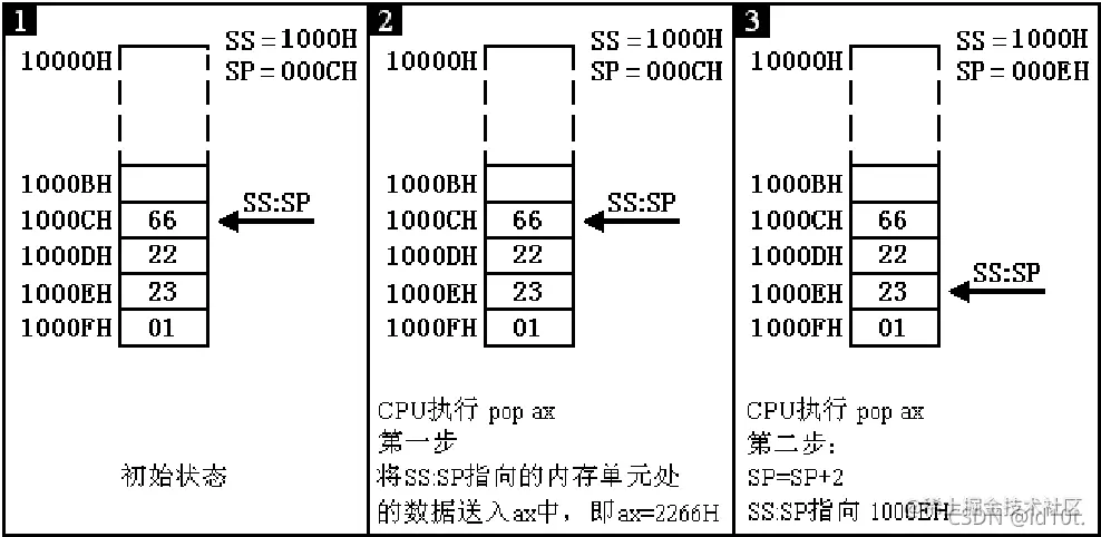 (1)将 SS:SP 指向的内存单元处的数据送入 ax 中; (2)SP = SP+2,SS:SP 指向当前栈顶下面的单元,以当前栈顶下面的单元为新的栈顶。