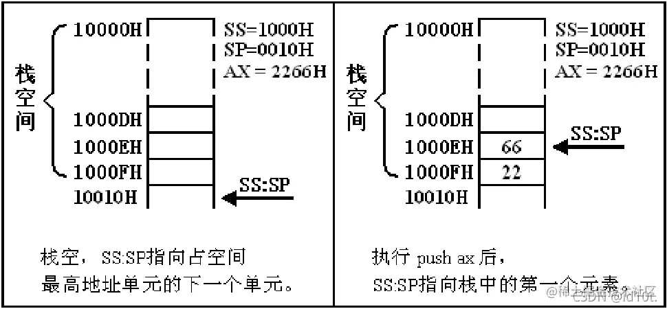 首先从栈操作指令所完成的功能的角度上来看,push、pop 等指令在执行的时候只修改 SP;所以栈顶的变化范围是0~FFFFH,从栈空时候的 SP=0,一直压栈,直到栈满时 SP=0;如果再次压栈,栈顶将环绕,覆盖了原来栈中的内容。