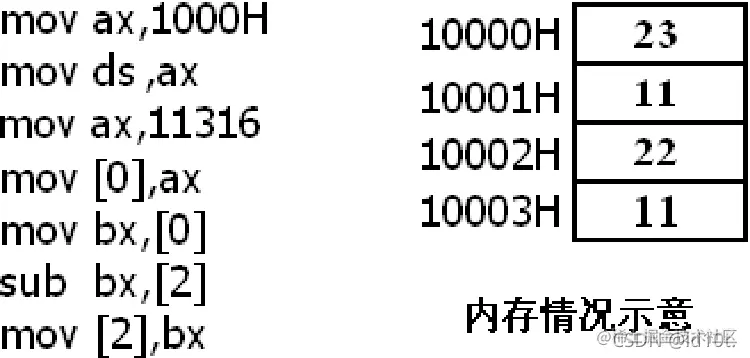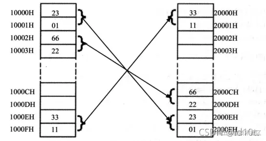 (4)在内存和寄存器之间传送字型数据时,高地址单元和高8位寄存器、低地址单元和低8位寄存器相对应。