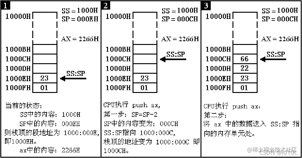 (2)将 ax 中的内容送入 SS:SP 指向的内存单元处,SS:SP 此时指向新栈顶。