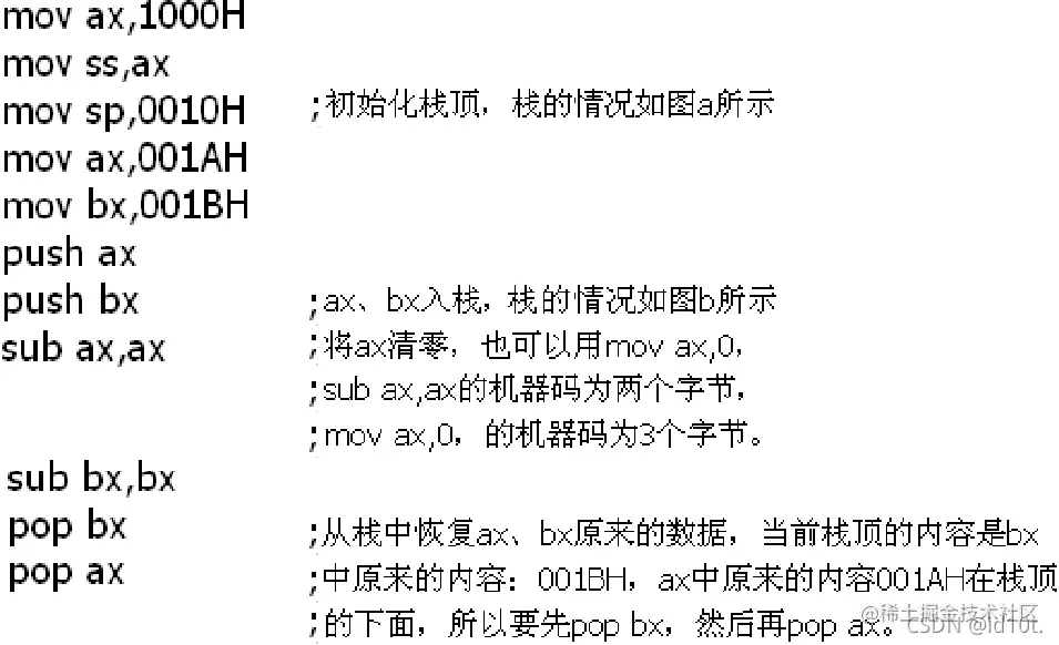 (4)任意时刻,SS:SP 指向栈顶元素。 (5)8086CPU 只记录栈顶,栈空间的大小我们要自己管理。 (6)用栈来暂存以后需要恢复的寄存器的内容时 ,寄存器出栈的顺序要和 入栈的顺序相反。 (7)push,pop 实质上是一种内存传送指令,注意它们的灵活应用。