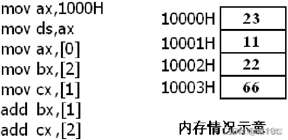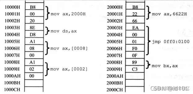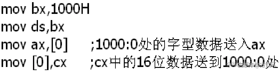 10000H表示为1000:0(段地址:偏移地址),将段地址1000H放入 ds,用 mov al,[0] 完成传送(mov 指令中的[]说明操作对象是一个内存单元,[]中的0说明这个内存单元的偏移地址是0,它的段地址默认放在 ds 中);
