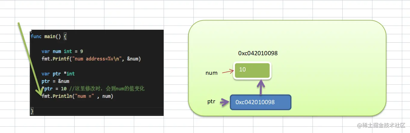 *ptr = 10 // 2. ptr ==> 访问的就是这个num的空间(9)