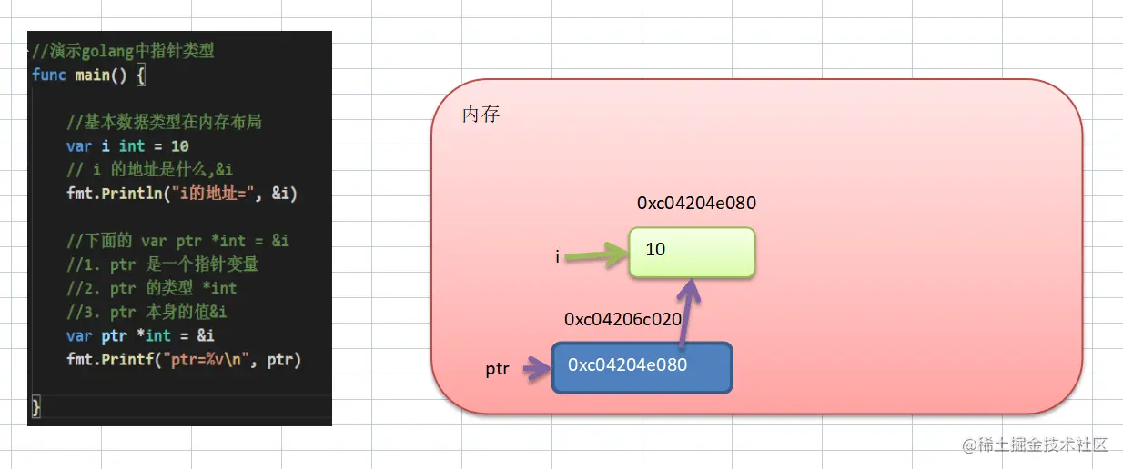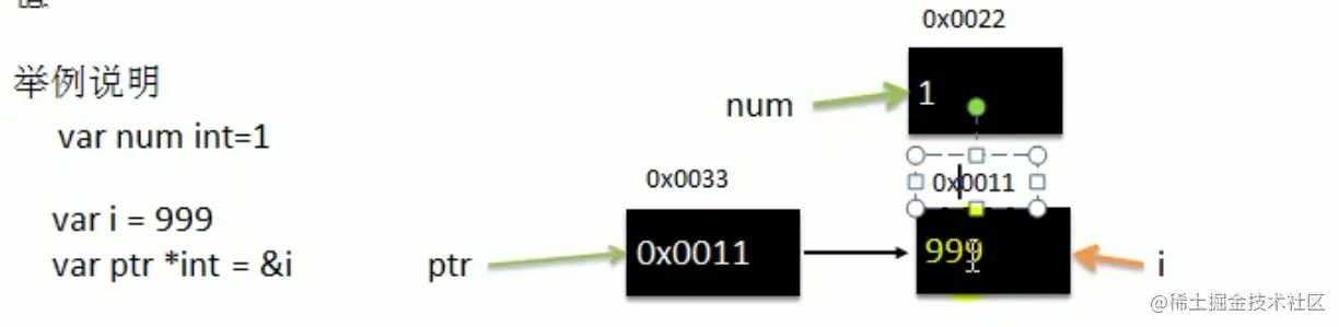 - 指针类型,指针变量存的是一个地址,这个地址指向的空间存的才是值,比如: