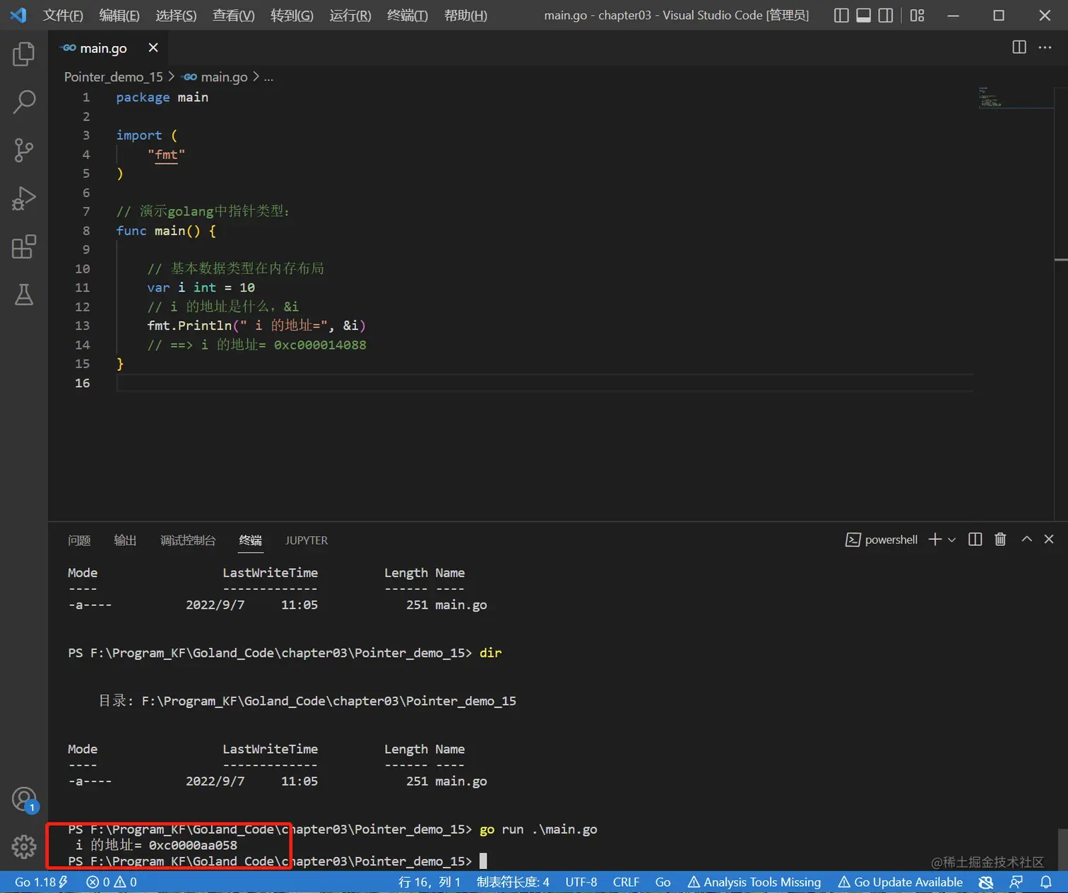 fmt.Println("i 的地址=", &i)