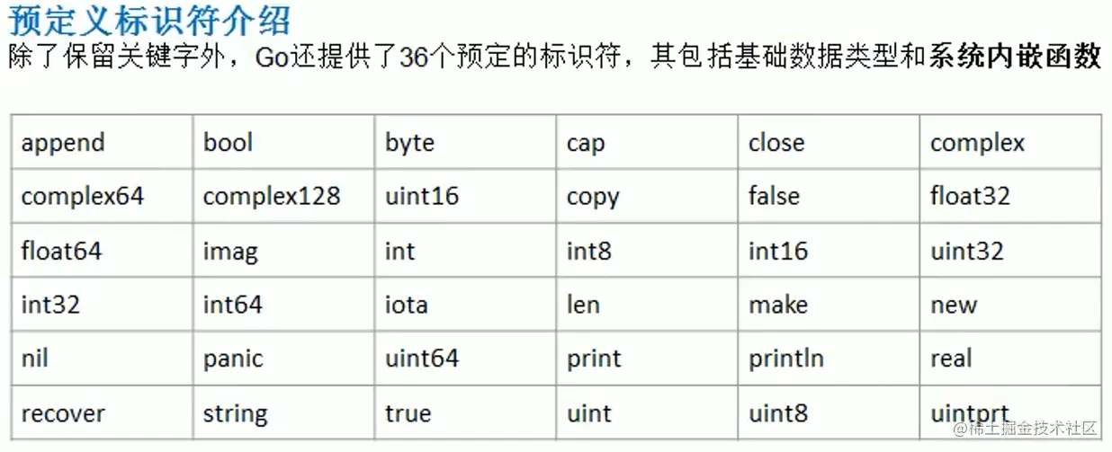 除了保留关键字外,Go还提供了36个预定的标识符,其包括基础数据类型和系统内嵌函数
