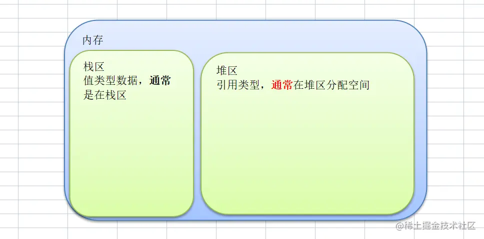 - 值类型:变量直接存储值,内存通常在栈中分配