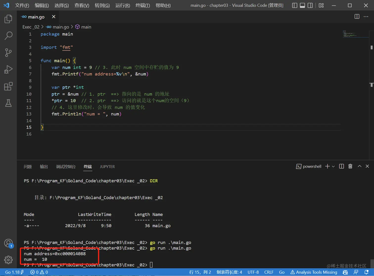 ptr = &num // 1. ptr ==> 指向的是 num 的地址