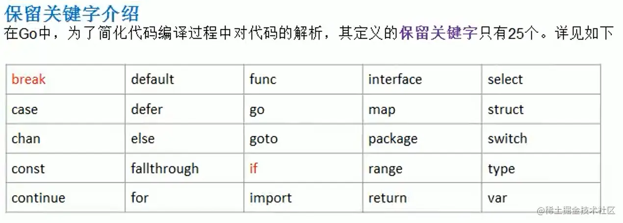 - 在Go中,为了简化编译过程中对代码的解析,其定义的保留关键字只有25个。