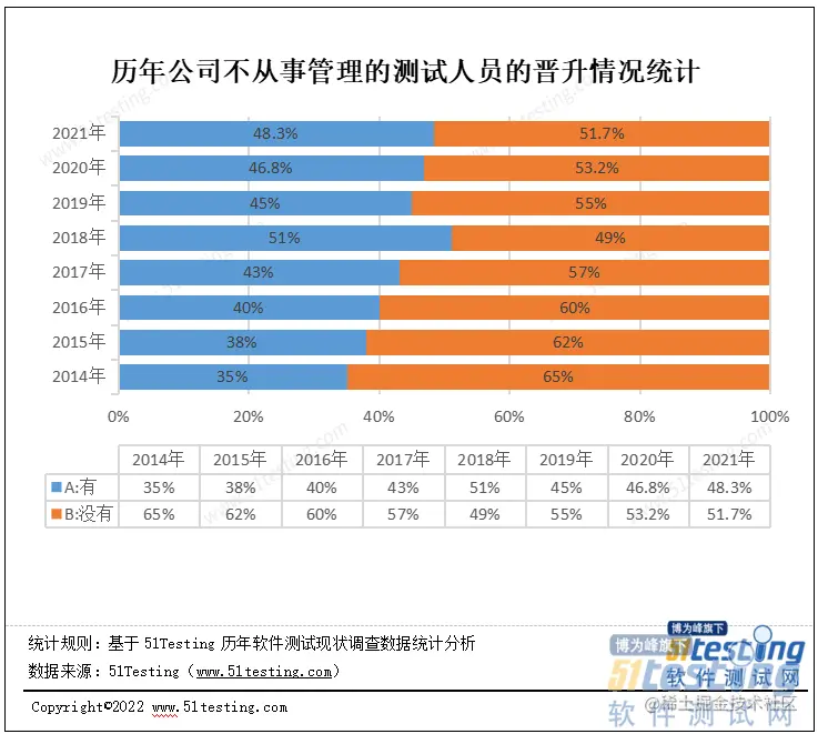 根据《2021软件测试行业调查报告》显示,48.3%的测试人员不从事管理相关工作依然有机会获得晋升。不从事管理相关工作没有晋升渠道的占51.7%。