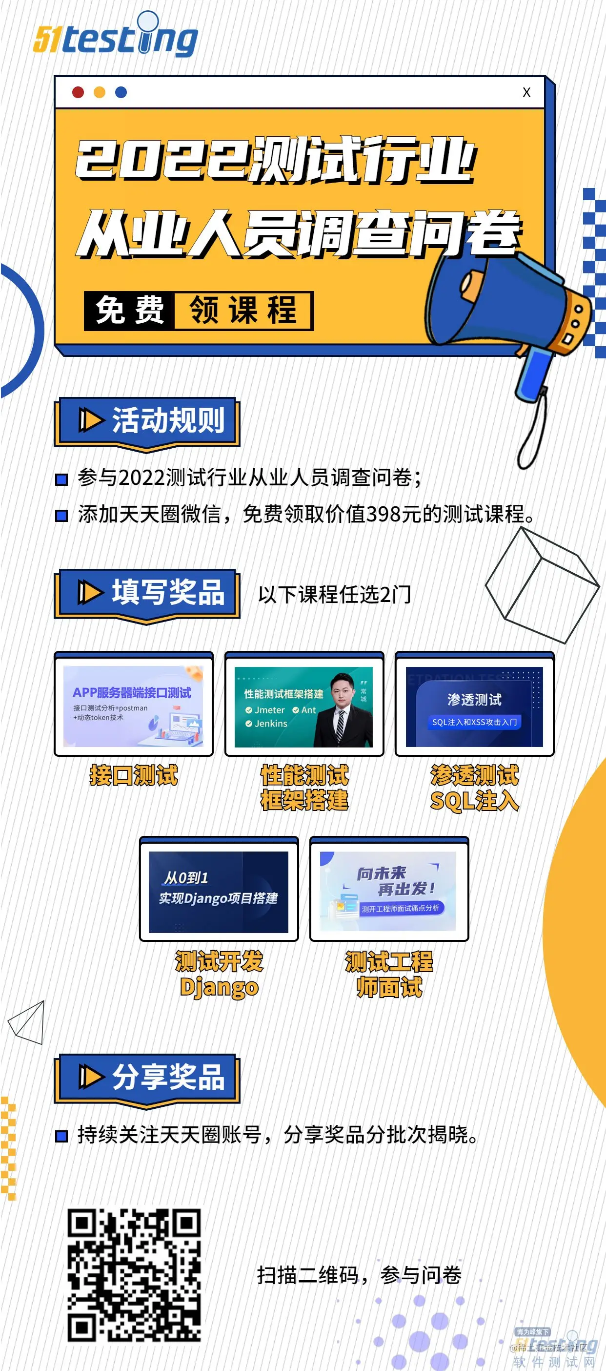 如果你心仪的课程超过了两门,欢迎你参与我们的“分享送好礼”活动(未答问卷的小伙伴,分享无效哦~),只要将下面的海报分享到你的朋友圈超过24小时,并截图给天天圈(quan51testing3),就能额外获得一门课程或者免费领取独家定制数据线一枚。期待大家的参与!