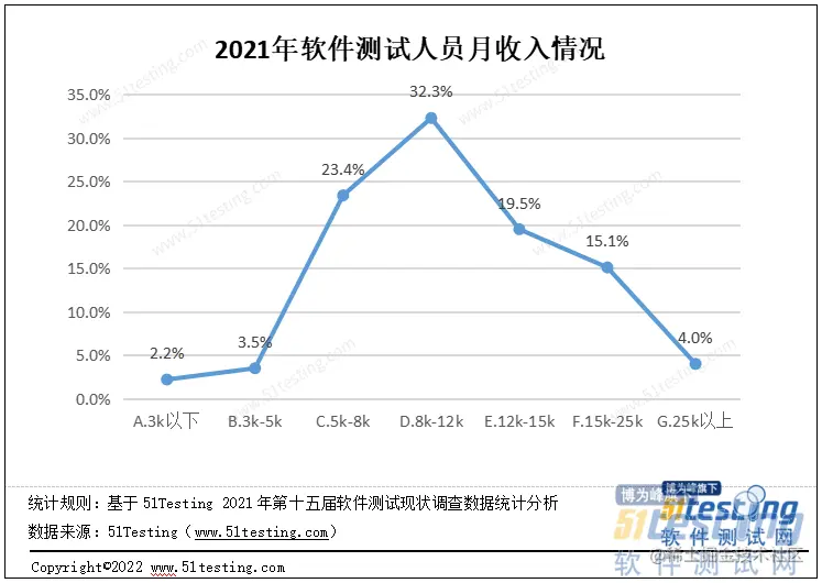 另外,《2021软件测试行业调查报告》显示,2021年软件测试从业人员月收入在8k-12k元之间的,占比32.3%;其次是月入5k-8k,占比23.4%;月收入12k-15k排名第三,占比19.5%;月收入在15k-25k的测试人员比例为15.1%。