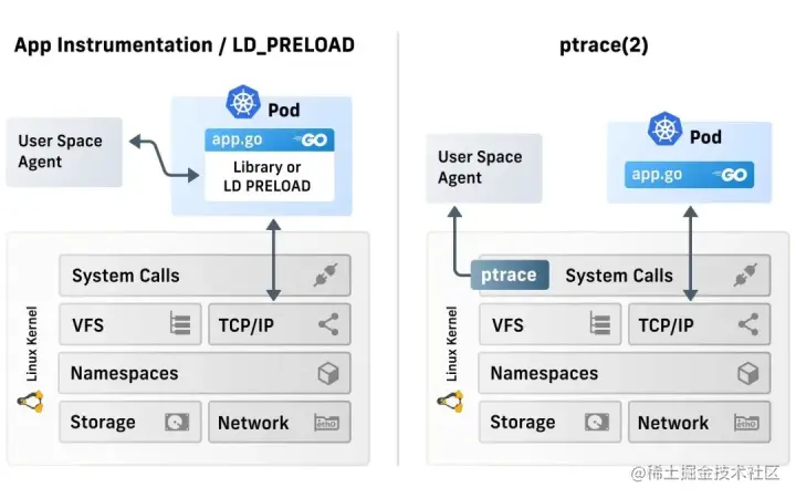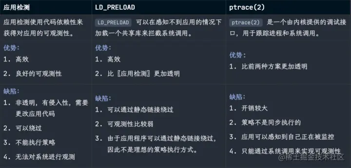 此类解决方案是在应用程序和系统调用层面上执行,并且可观测性方案也各不相同。它们都有一个用户空间代理,这个代理依赖于按定义收集的可观测性数据,然后对其作出反应,且无法对内核级别的事件进行观测。