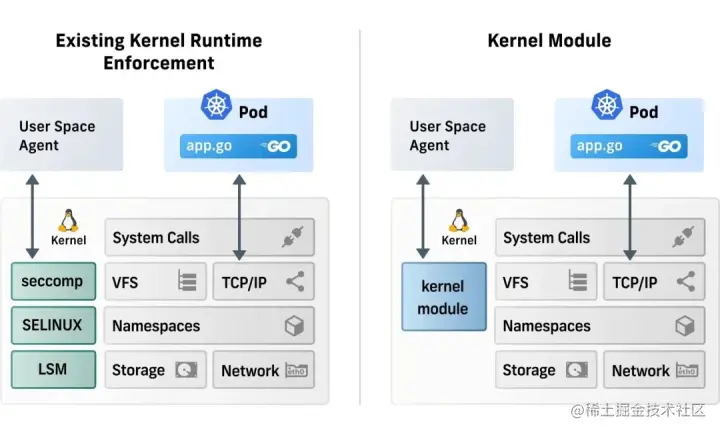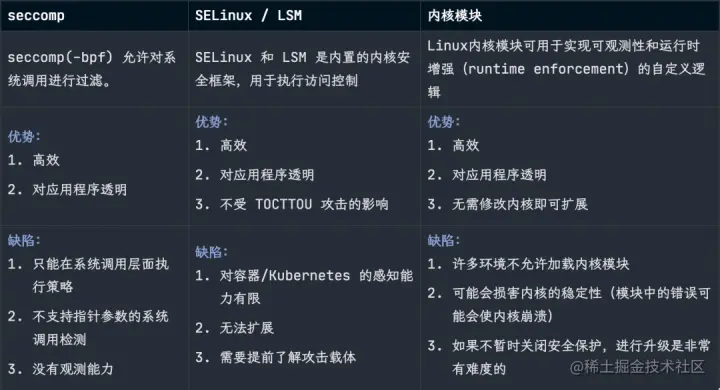 此类解决方案是直接在内核层面操作,主要针对运行时增强(runtime enforcement),观测能力较弱(甚至没有观测能力)。内置的内核系统提供了非常多的策略执行选项,但内核在构建时却只重点提供访问控制的能力,而且非常难以扩展,例如内核是无法感知到 Kubernetes 和容器的。虽然内核模块解决了可扩展性问题,但由于其产生的安全风险,在很多场景下往往不是一种明智的选择。