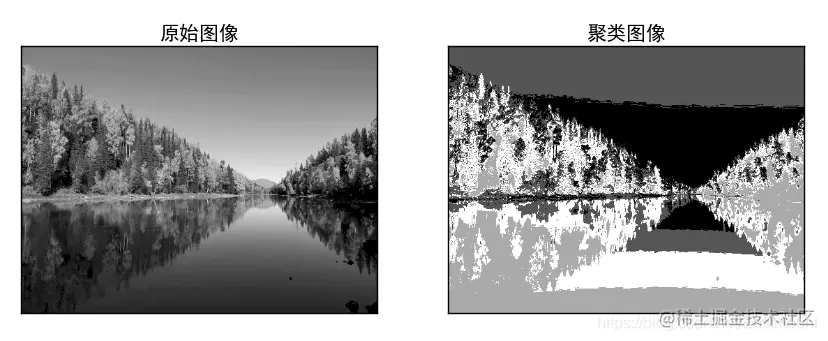 输出结果如图所示,左边为灰度图像,右边为K-Means聚类后的图像,它将灰度级聚集成四个层级,相似的颜色或区域聚集在一起。