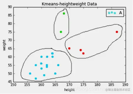 下图是对身高和体重进行聚类的算法,将数据集的人群聚集成三类。