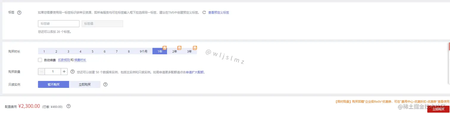 最后可以设置一下标签,也就是给自己的数据库加个别名,购买时长的选择,一般时间长点的会有优惠。