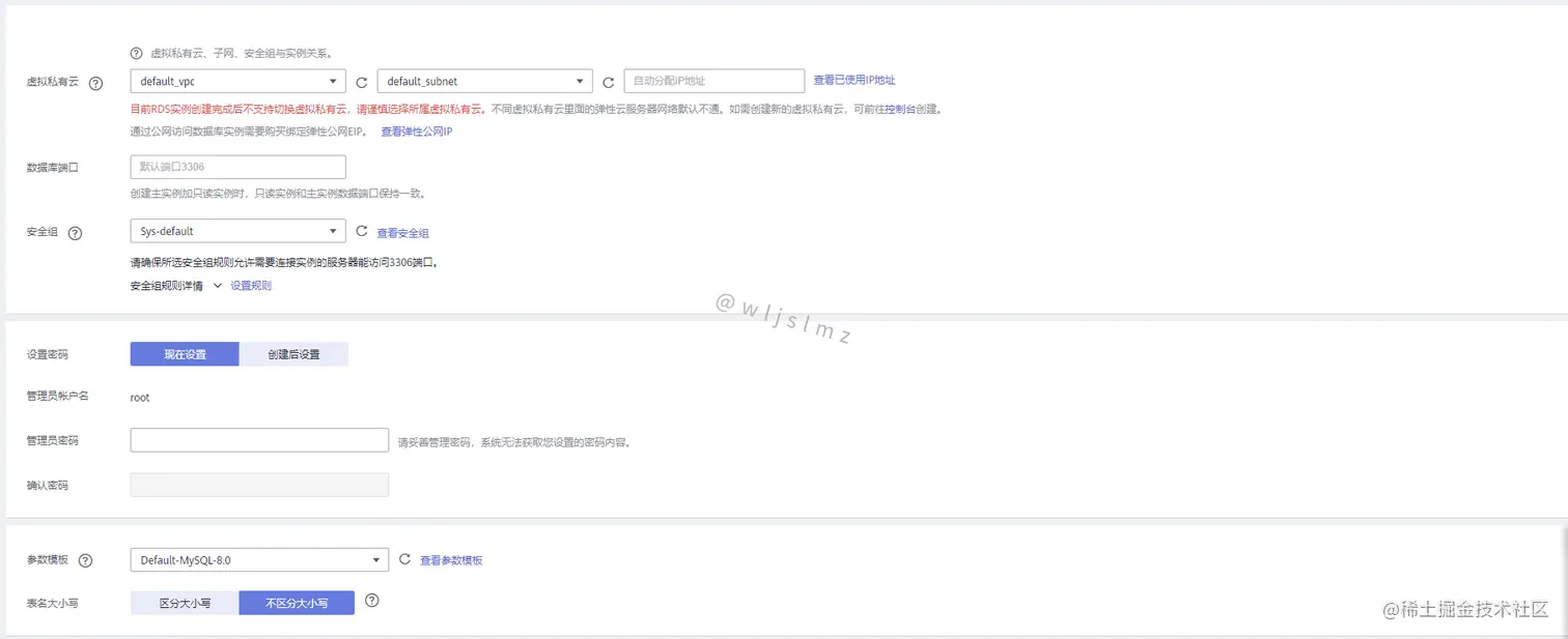 下面就是选择虚拟私有云,如果没有特殊情况,可以默认,端口号也可以默认,一般是3306,可以根据自己的项目需要进行自定义。安全组,因为不是云服务器,所以自定义安全策略的情况不是很多,这里也可以默认。数据库密码可以选择在此页面进行配置,如果觉得现在不想配置,可以先不配置,等购买后再进行配置。
