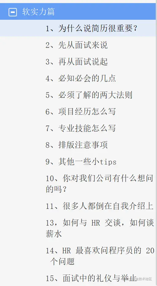 不止包含了技术内容,还给大家总结了一份面试的“软实力”,什么叫“软实力”?就是教大家如何去写简历/如何和 HR 沟通,可以更有效的帮助大家拿到更多的薪资!