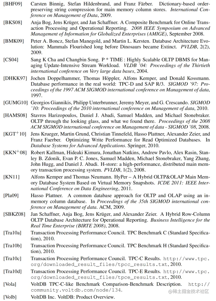 TPC(Transaction Processing Performance Council,事务处理性能委员会)指定了在工业界和学术界广泛使用的基准来测量数据库系统的性能特征。TPC-C 及其后继产品 TPC-E 模拟了 OLTP 工作负载。TPC-C 中使用的模型由围绕产品或服务的管理、销售和分销的九个表(relation)和五个事务组成。数据库的初始数据随机产生,随着新订单的处理而更新。TPC-E 模拟了一家经纪公司的工作负载。它有一个更复杂的模型和伪真实的内容,用来更好地匹配实际的客户数据。但是,与 TPC-E 相比,TPC-C 的使用更为普遍【Tra10c,Tra10d】,因此具有更好的可比性。