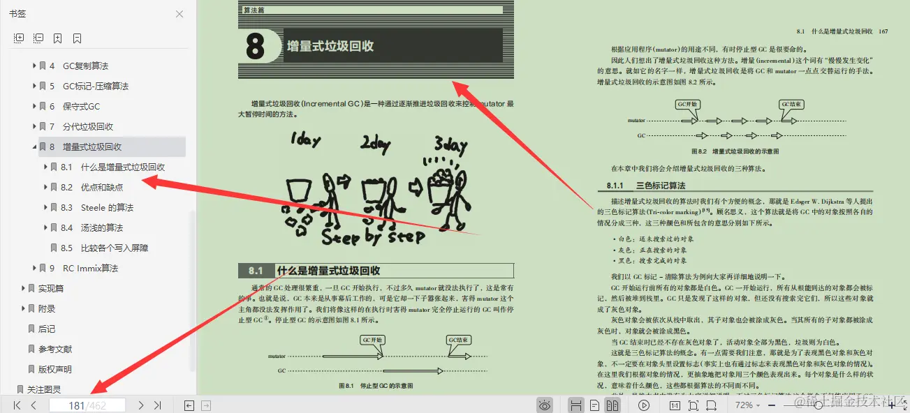 8增量式垃圾回收: 增量式垃圾回收(Incremental GC )是一种通过逐渐推进垃圾回收来控制mutator最大暂停时间的方法。