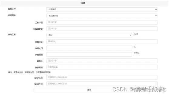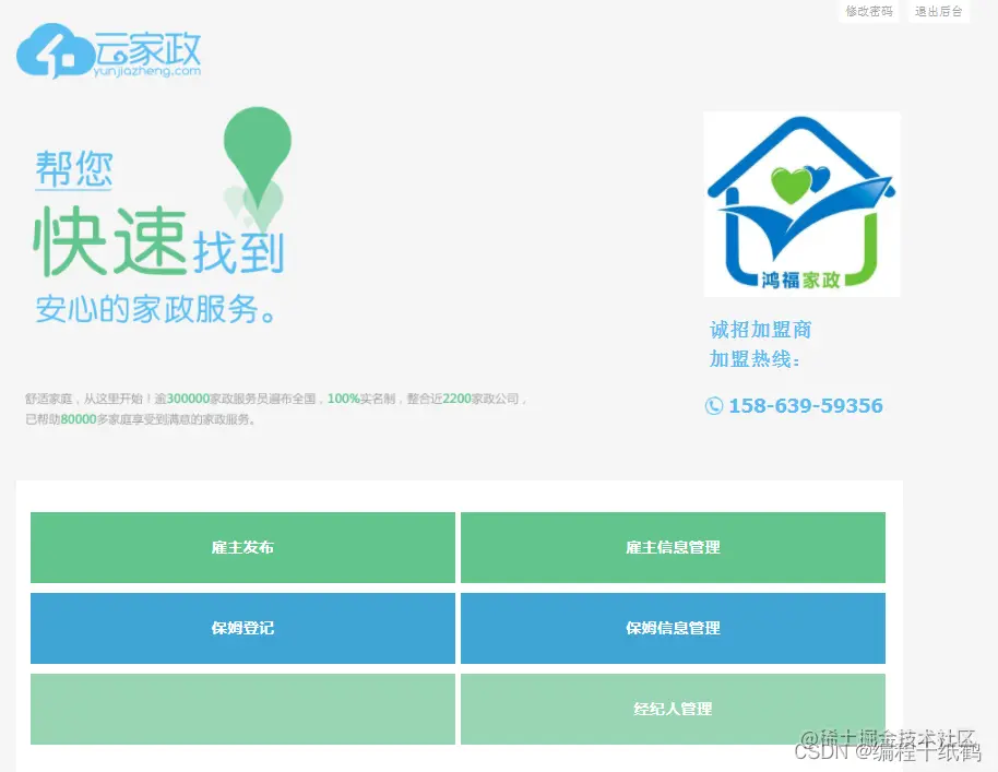 项目介绍:本项目主要实现了家政服务平台的管理信息,主要实现雇主信息管理、保姆信息管理、经纪人信息管理等相关信息管理功能。