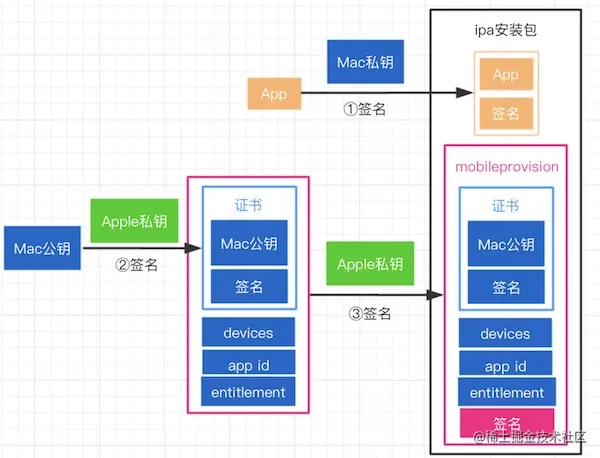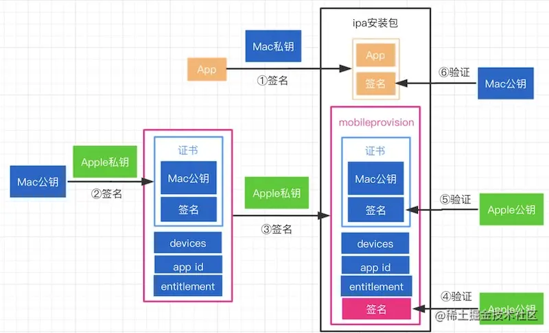 将App提交审核后,苹果会用官方的私钥对我们提交的App重签名,用户下载到手机后,iOS设备内置的公钥会对App进行验证,验证成功即可正常使用