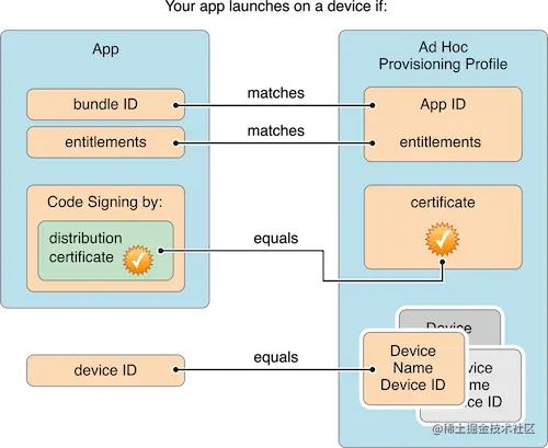 Apple私钥进行签名,生成最后的mobileprovision文件。而且生成的mobileprovision文件就决定了当前App可以安装的设备有哪些,可以安装的App的BundleId,以及App所拥有的权限