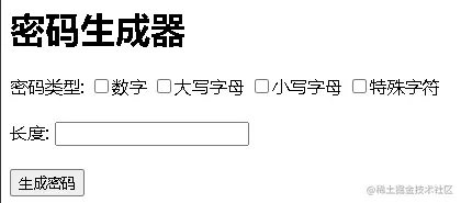 该项目让用户选择密码类型,有 数字、大小写字母 以及 特殊字符, 再让用户选择一个密码长度, 最后是密码生成按钮。整个UI
