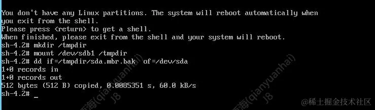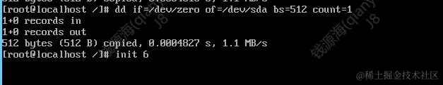 将/dev/zreo中的数据拷贝至sda的MBR扇区中,以达到模拟破坏MBR扇区的效果。\