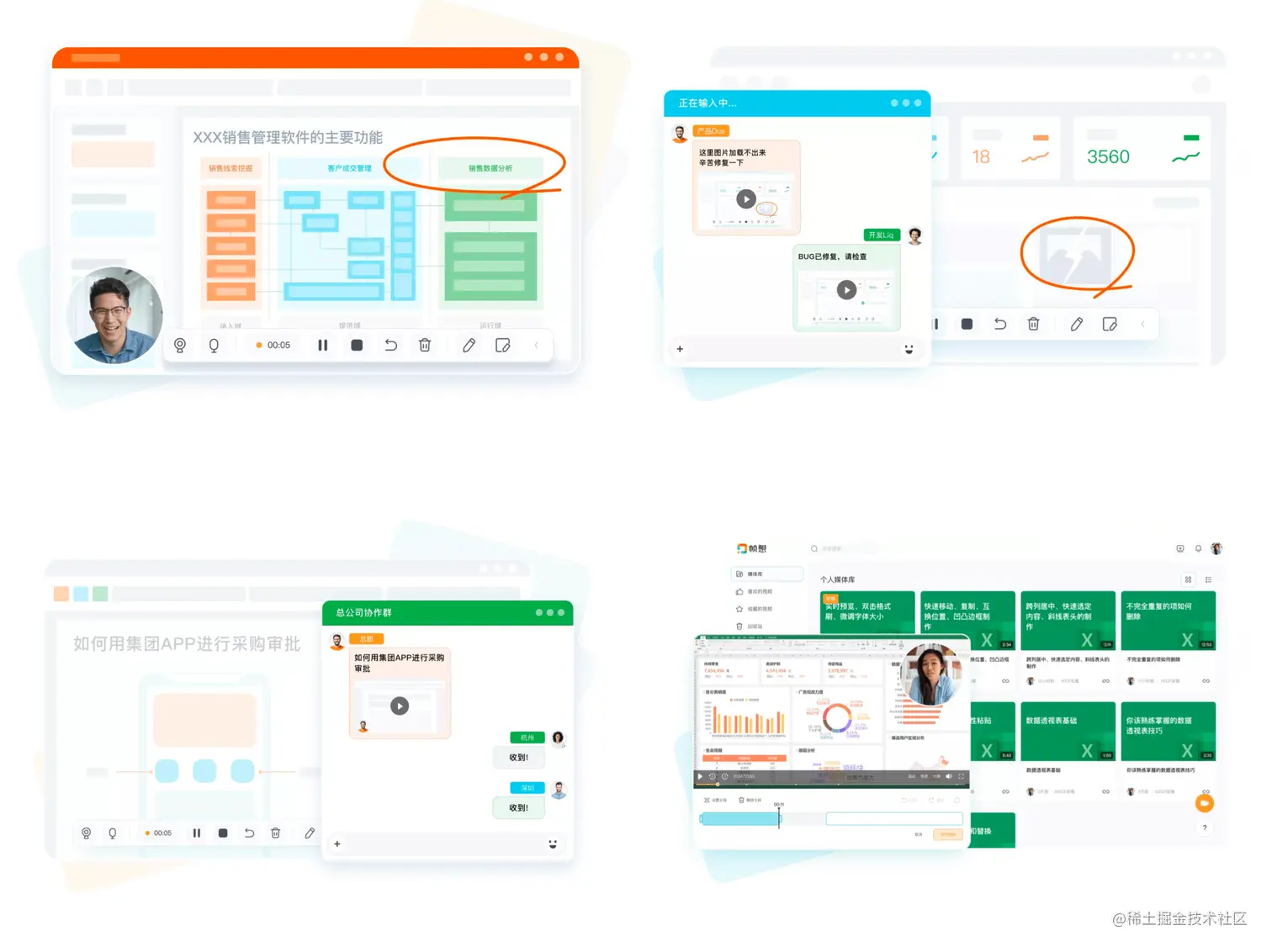 其产品主打特色是,通过 录屏+摄像头 的方式录制短视频,把桌面操作、演示指导、语音说明以视频的形式,通过链接发送给小伙伴,对方可以在线观看,更直观的了解情况。