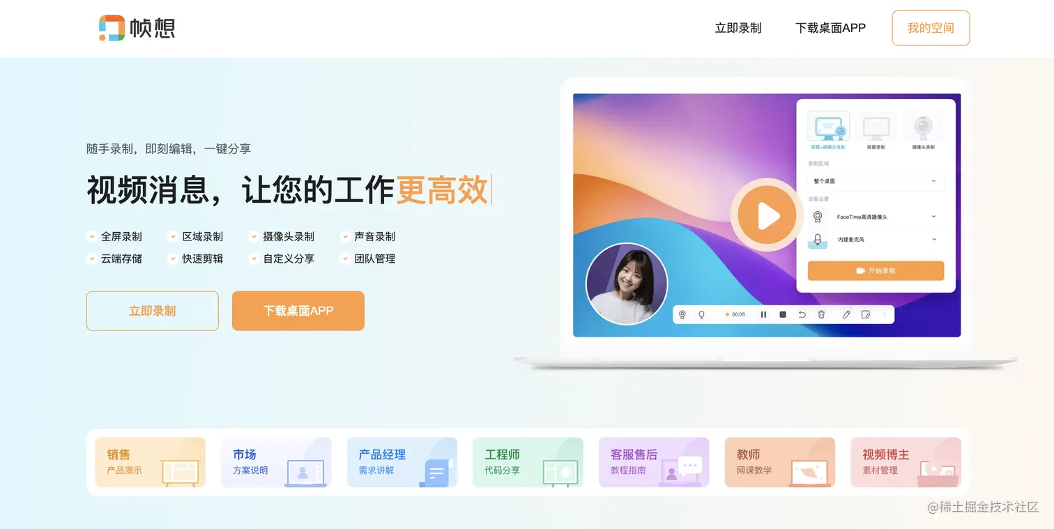 相比于海外SaaS惯用的大图大脸式介绍,帧想就更贴近中国人习惯了,官网直接提供了“立即录制” 和 “下载桌面APP”的按钮,点击就能直接开始。