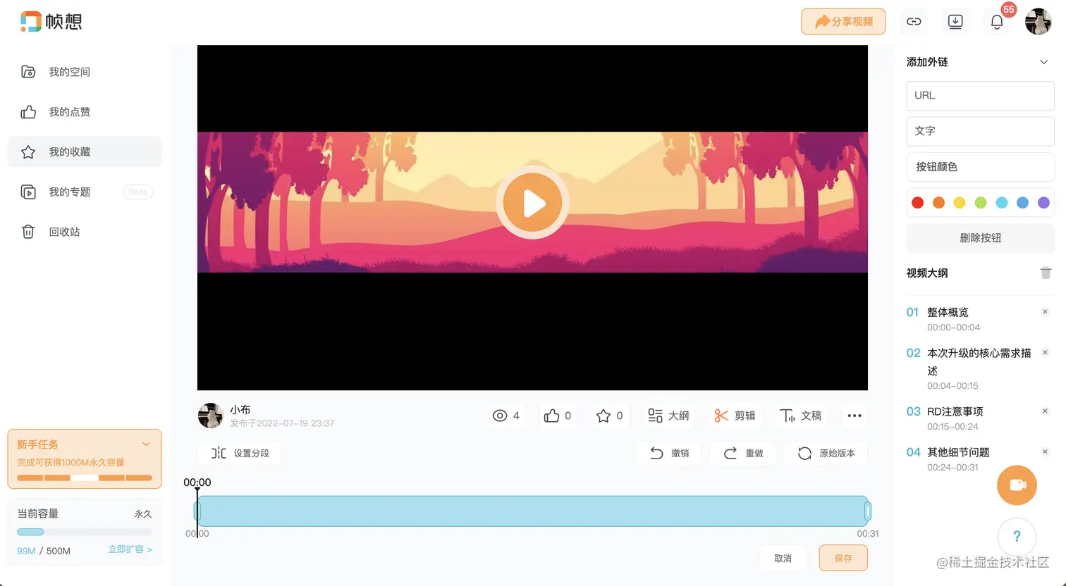 - 一个是分段大纲功能,能够给视频打上锚点,有点像B站视频里的那种分章节的样子(这回我一次性把RD、FE、QA、UI要关注的点都说完,让他们自己看去吧!啦啦啦 ~ )