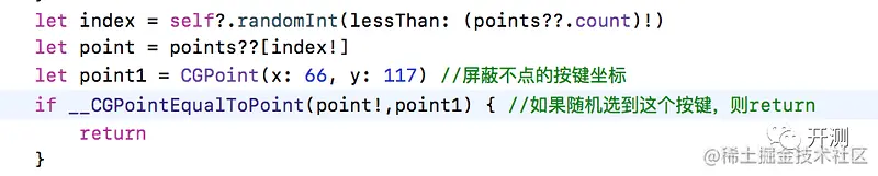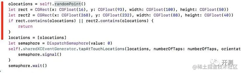同样也可以在addXCTestTapAction()接口中添加对点击随机坐标点的限制,如下图修改的代码部分,即屏蔽了对rect和rect2矩形区域的点击。