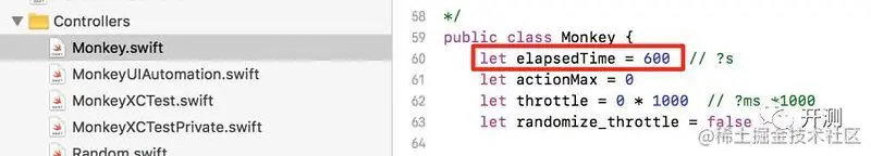 在server/Controller/Monkey.swift文件中,修改elapsedTime为需要运行Monkey的时长,单位是秒,如下图:\