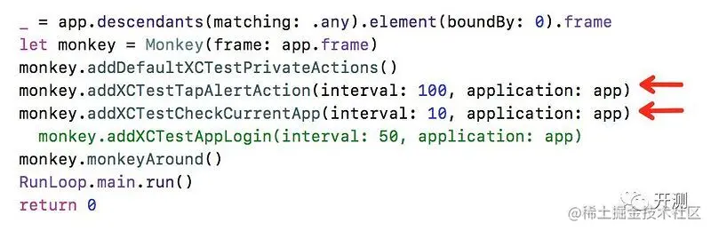 在XCTestWDMonkey文件中,默认调用addXCTestCheckCurrentApp接口开启APP后台或退出检测。它以参数intervarl为时间间隔,检查被测app是否在当前运行,如果没有则再启用app。在测试场景中,如果不需要这项检查,则注释调用该接口即可。