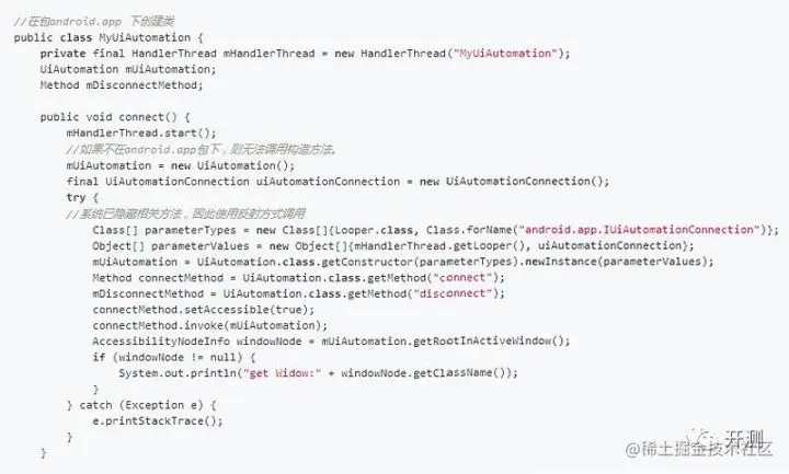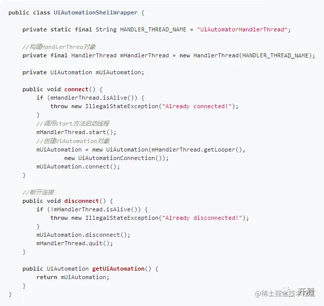 UiAutomationShellWrapper 类的connect方法初始化了UiAutomation对象,UiAutomation提供测试所需功能API。