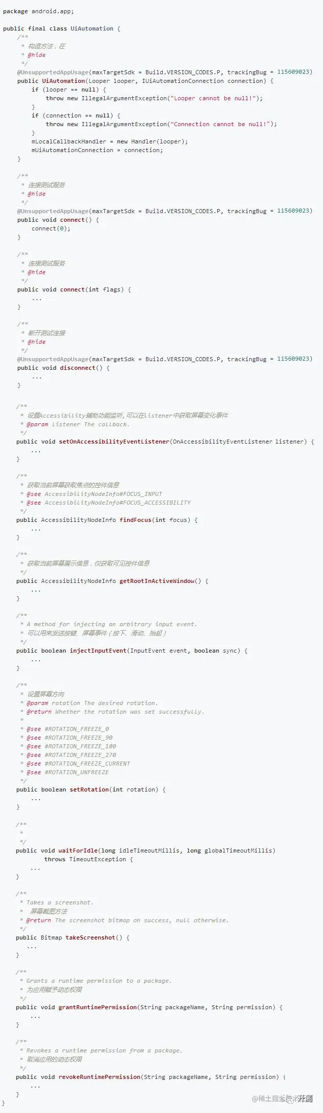 到此uiautomator进程已经获取UiAutomation对象,可以通过UiAutomation对象获取屏幕元素信息、发送按键事件、滑动屏幕、点击屏幕等。以下代码展示部分重要API,无论是Uiautomator1.0还是Uiautomator2.0最终都是通过UiAutomation对象来执行测试动作的。