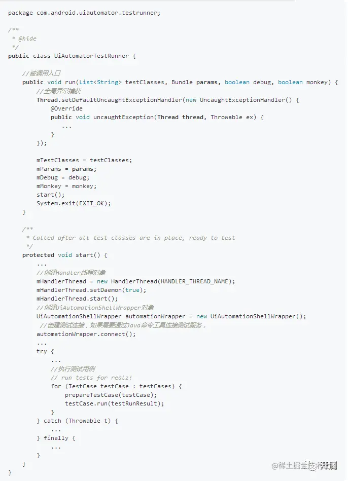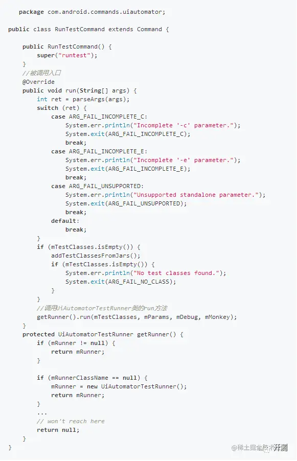 RunTestCommand.run()方法将具体的执行业务递交给UiAutomatorTestRunner类的run方法执行