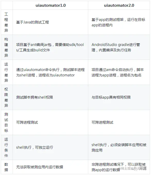 Uiautomator是Android原生测试框架,可以用于白盒接口测试也可以用于UI自动化测试,Uiautomator分1.0版本与2.0版本,它们都是基于UiAutomation的测试框架,都是通过UiAutomation的接口操作设备, 1.0权限更高,运行更灵活,2.0针对app定制化更高,在同进程内运行,可以获取被测app的运行数据,具体选用哪个框架还是根据业务场景灵活选择。